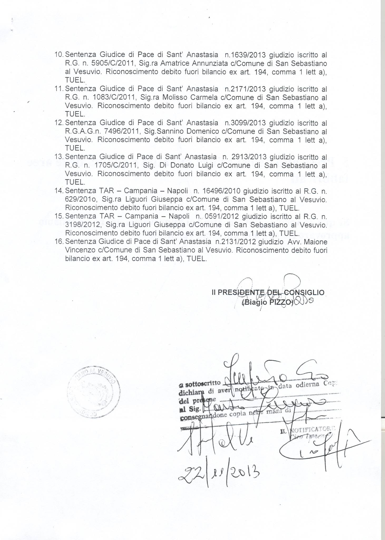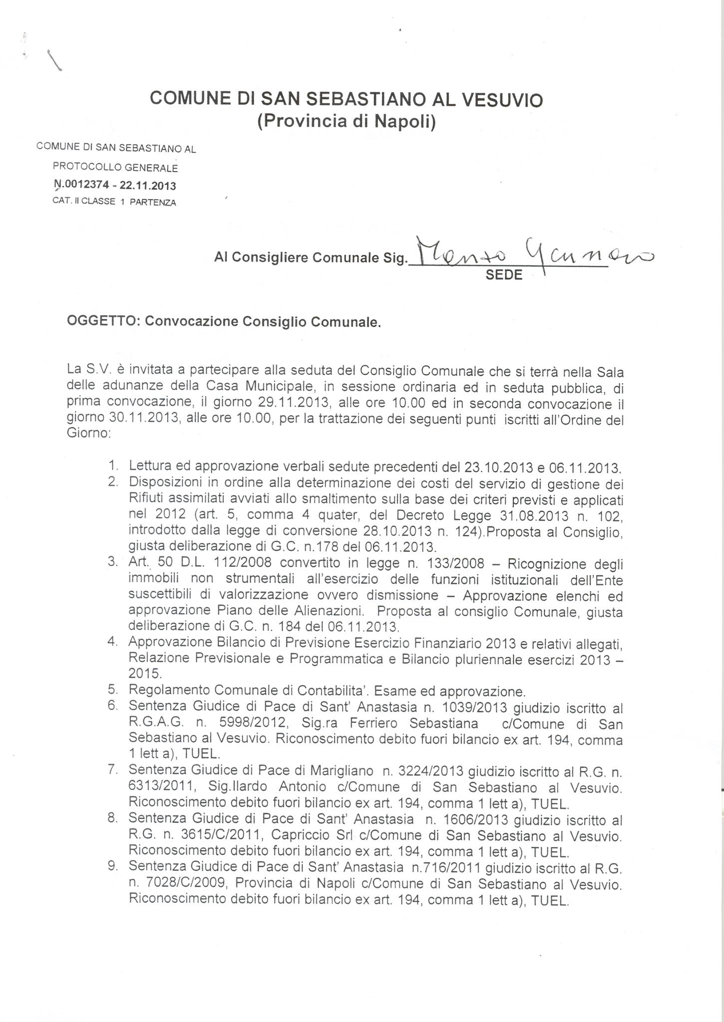 San Sebastiano al Vesuvio, Convocazione alla seduta del Consiglio Comunale per il giorno 29.11.2013 alle ore 10.00 in prima convocazione e per il giorno 30.11.2013 ore 10.00 in seconda convocazione. Tutti i cittadini sono invitati a partecipare.