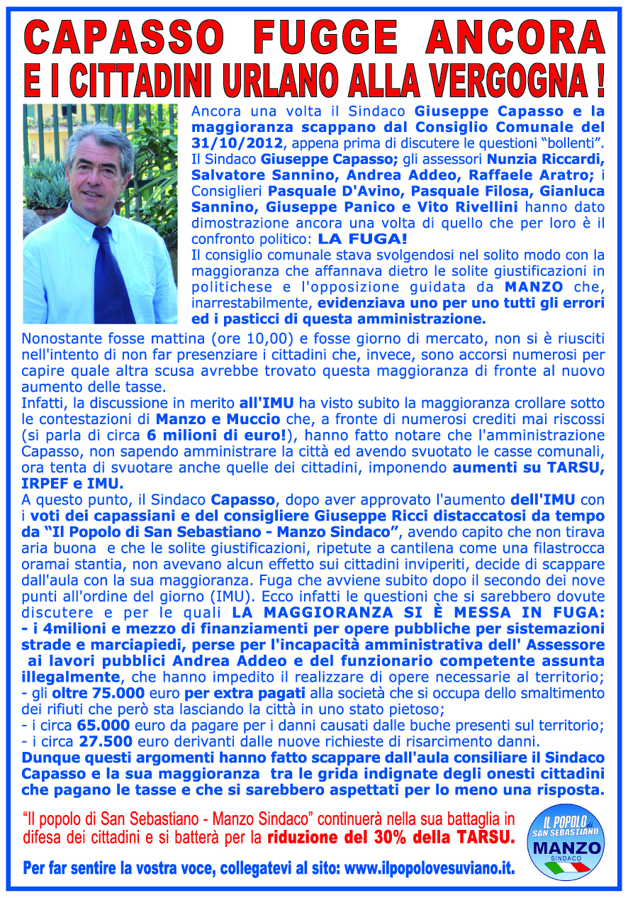 Cari Cittadini, ancora una volta siamo qui a spiegarvi cosa è accaduto nell’ultimo Consiglio Comunale del Comune di San Sebastiano al Vesuvio che si è tenuto in data 31 Ottobre 2012 , basterà cliccare sul manifesto per avere una ampia panoramica degli accadimenti.