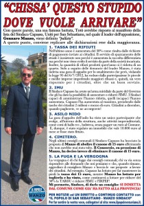 e vi metteranno alle strette ormai siete schedati non vi molleranno più.cosi mangiafuoco non può dire: la crisi, il governo centrale, i fondi,la regione e tutte le tarantelle che portava in consiglio comunale.ormai i nodi vengono al pettine altro che manifesti, che va tutto bene, e MANZO è un “pallista” le verità e i fatti li stiamo vedendo non serve più che vi diciamo VERGOGNATEVI !!! meditate gente meditate !!!!!!