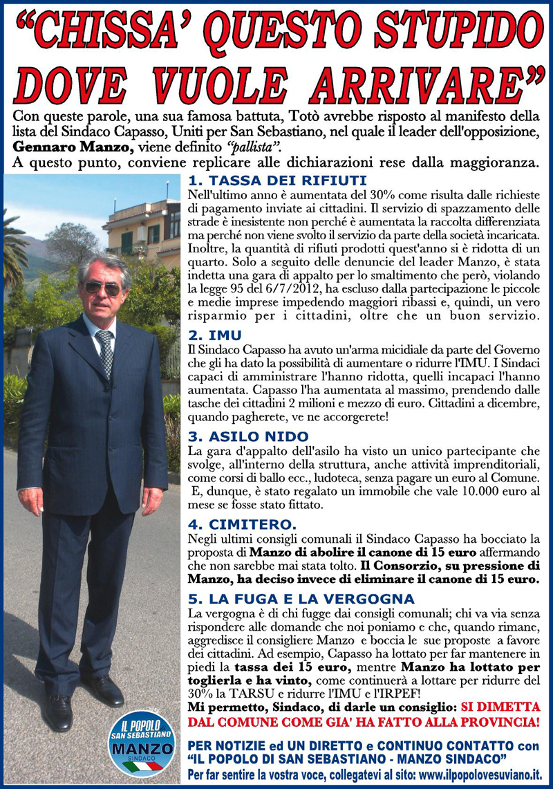 3 Responses to CON UNA BATTUTA DI TOTO’, MANZO RISPONDE ALLA VOLGARE ESPRESSIONE DELLA LISTA DEL SINDACO CAPASSO