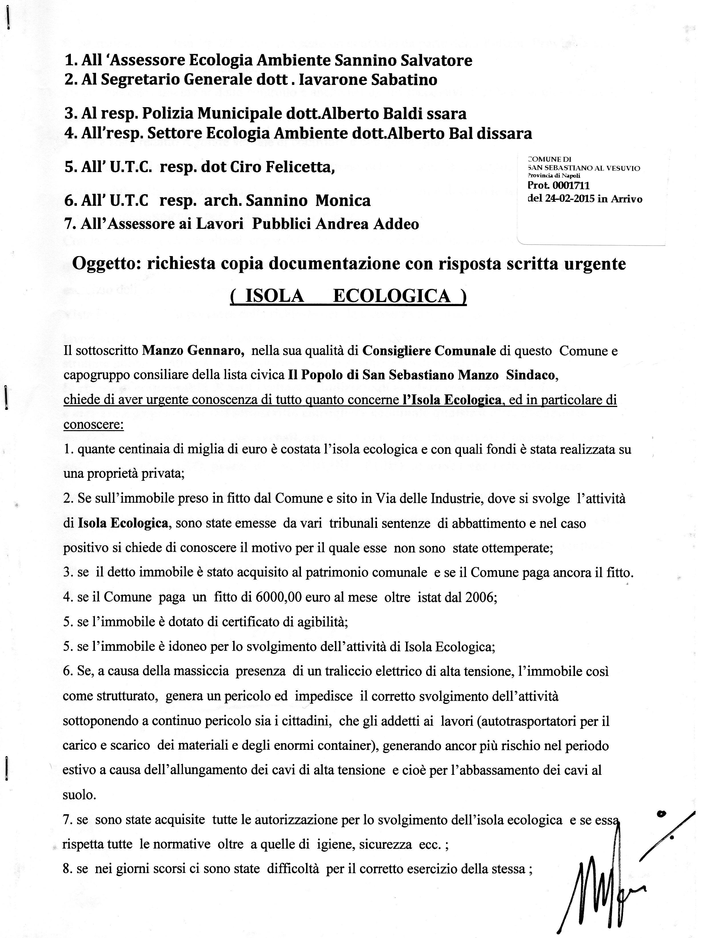IL POPOLO DI SAN SEBASTIANO MANZO SINDACO HA PRESENTATO RICHIESTA URGENTE PER CONOSCERE TUTTO QUANTO CONCERNE L’ISOLA ECOLOGICA E IN PARTICOLARE: