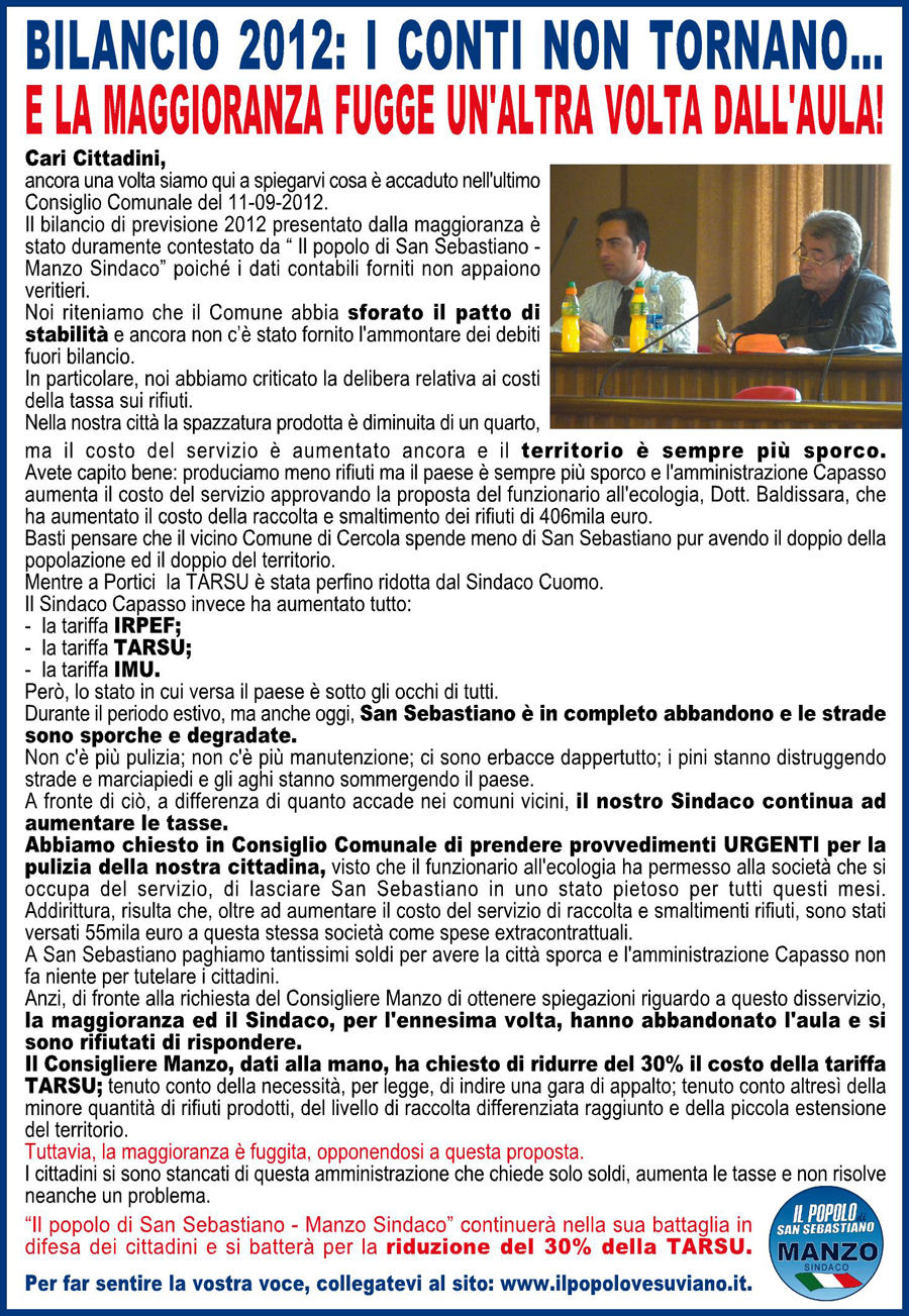 Cari Cittadini, ancora una volta siamo qui a spiegarvi cosa è accaduto nell’ultimo Consiglio Comunale del Comune di San Sebastiano al Vesuvio che si è tenuto in data 11 Settembre 2012 , basterà cliccare sul manifesto per avere una ampia panoramica degli accadimenti.